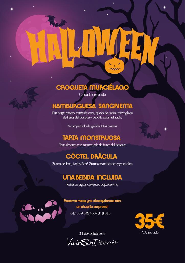 Únete a nosotros en la noche más terrorífica del año con una cena de lo más divertida y deliciosa. Haz ya tu reserva y disfruta de algunos de nuestros platos estrellas adaptados a Halloween como la hamburguesa sangrienta, la croqueta murciélago o la tarta monstruosa. Además, en el menú está incluido nuestro cóctel Drácula.